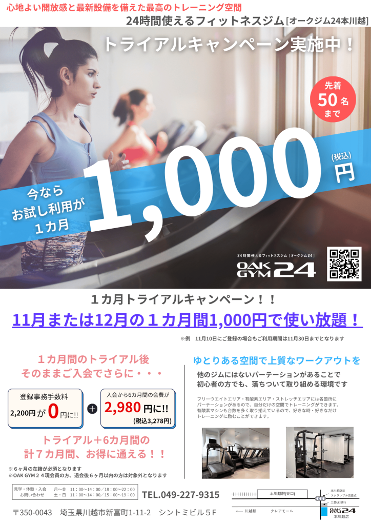 2025-05-26 お知らせ キャンペーン 2025年11月 トライアルキャンペーン実施中! 【OAKGYM24 先着50名様限定の入会キャンペーン実施中!】 ご入会の方はこちらをクリック ※OAKGYM24現会員、退会後6ヵ月の以内の再入会はキャンペーン対象外になります。※本キャンペーンは予告なく終了する場合がございます。
